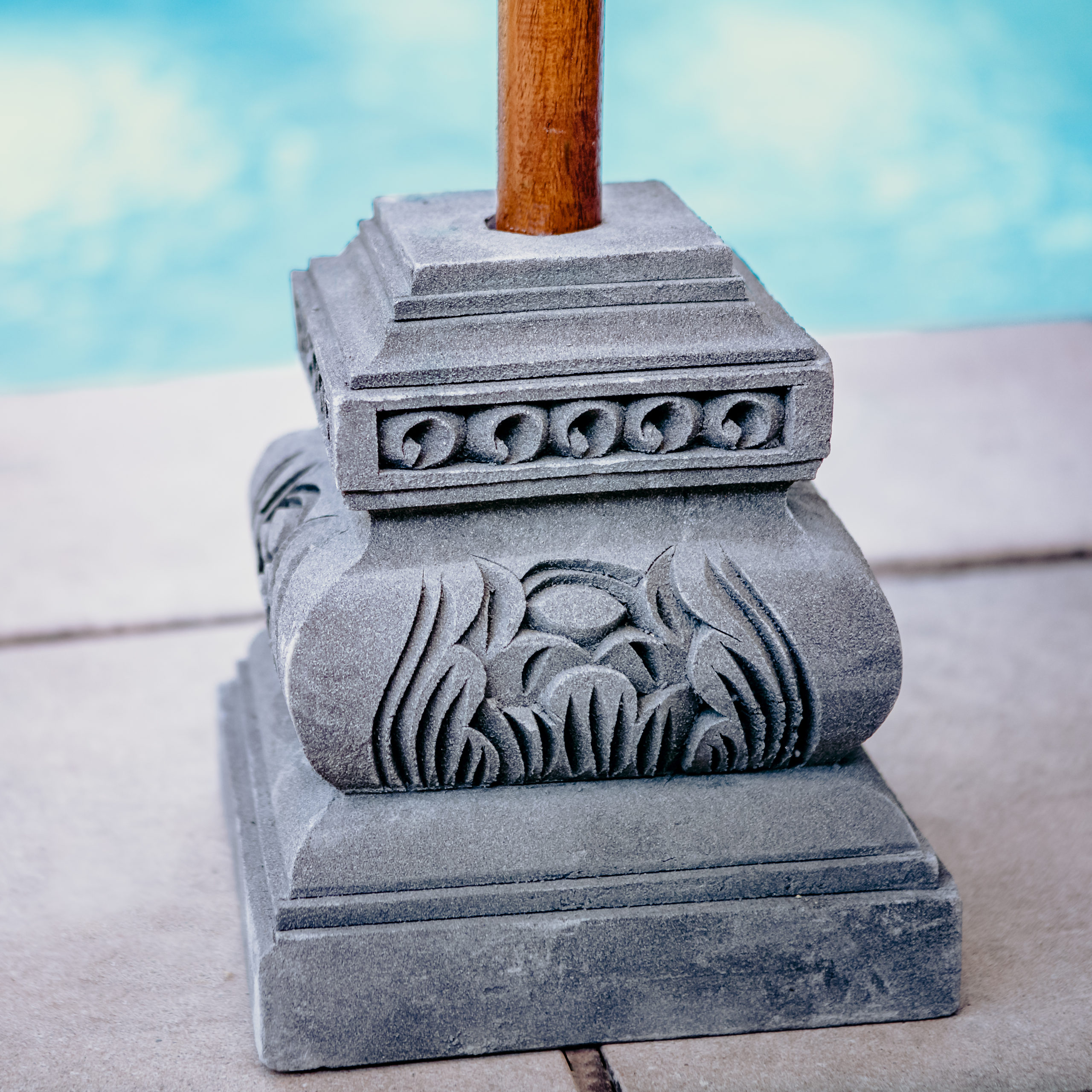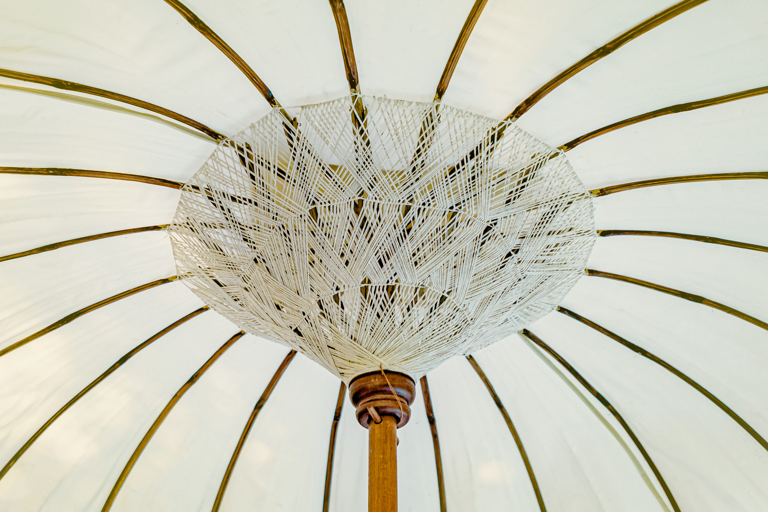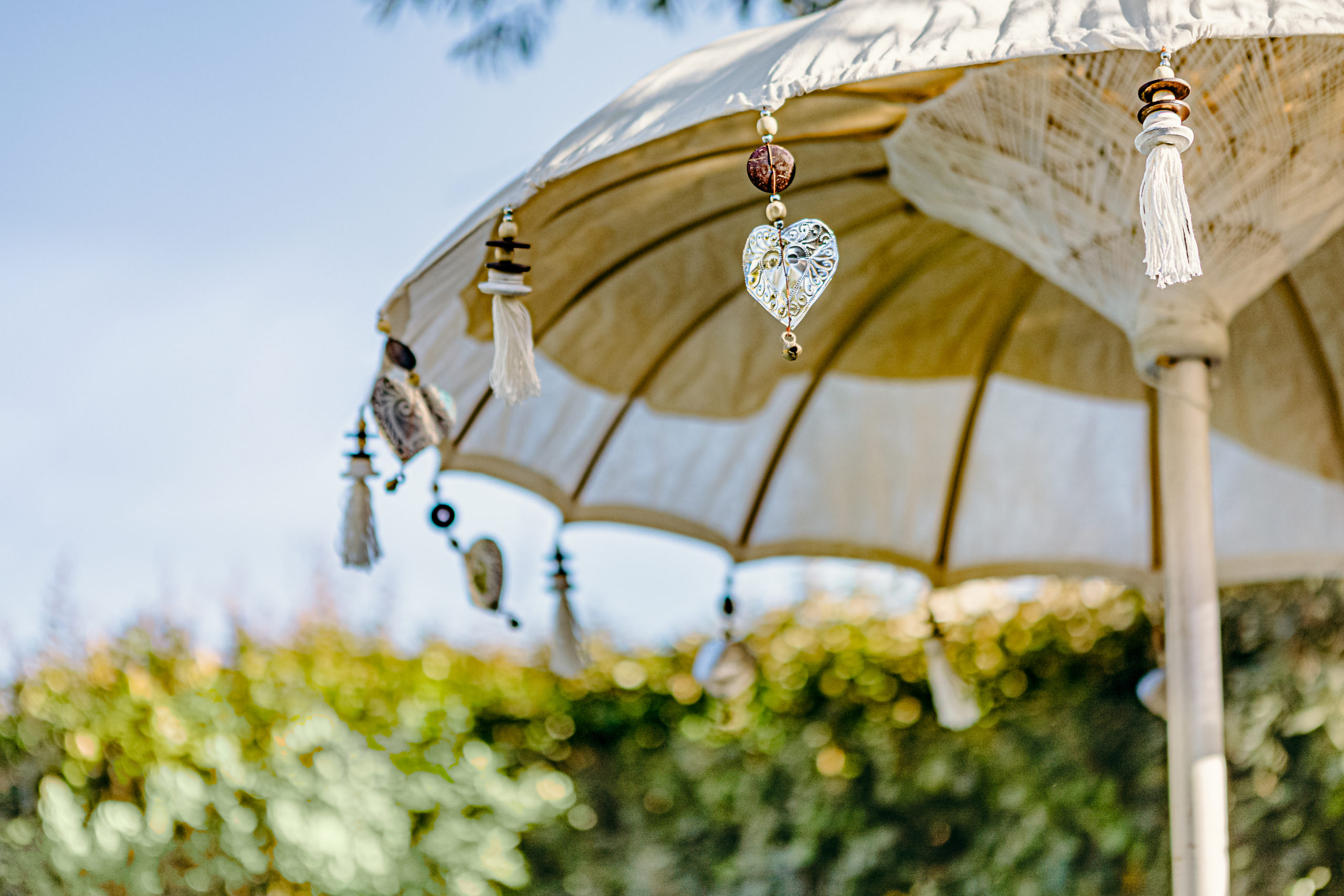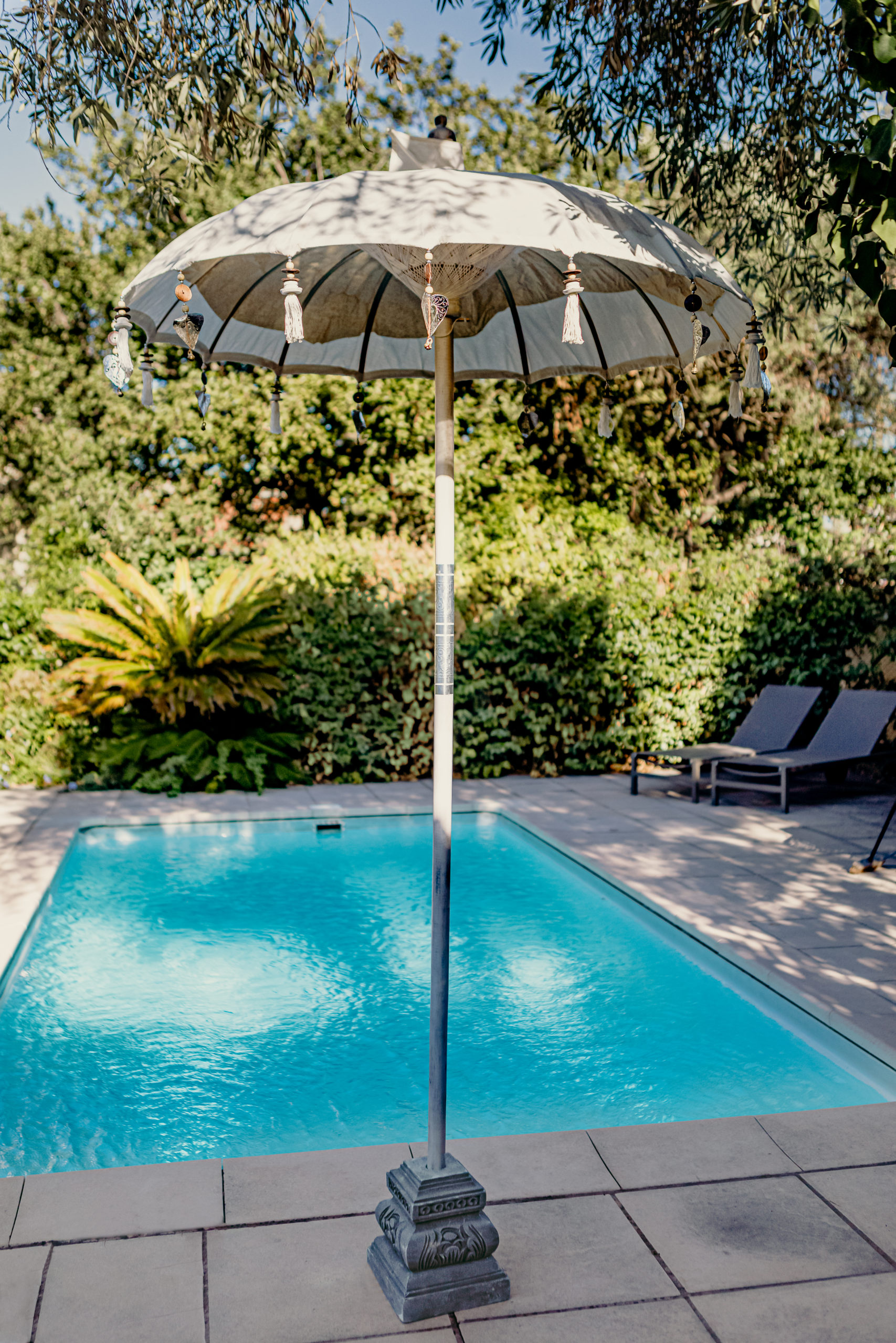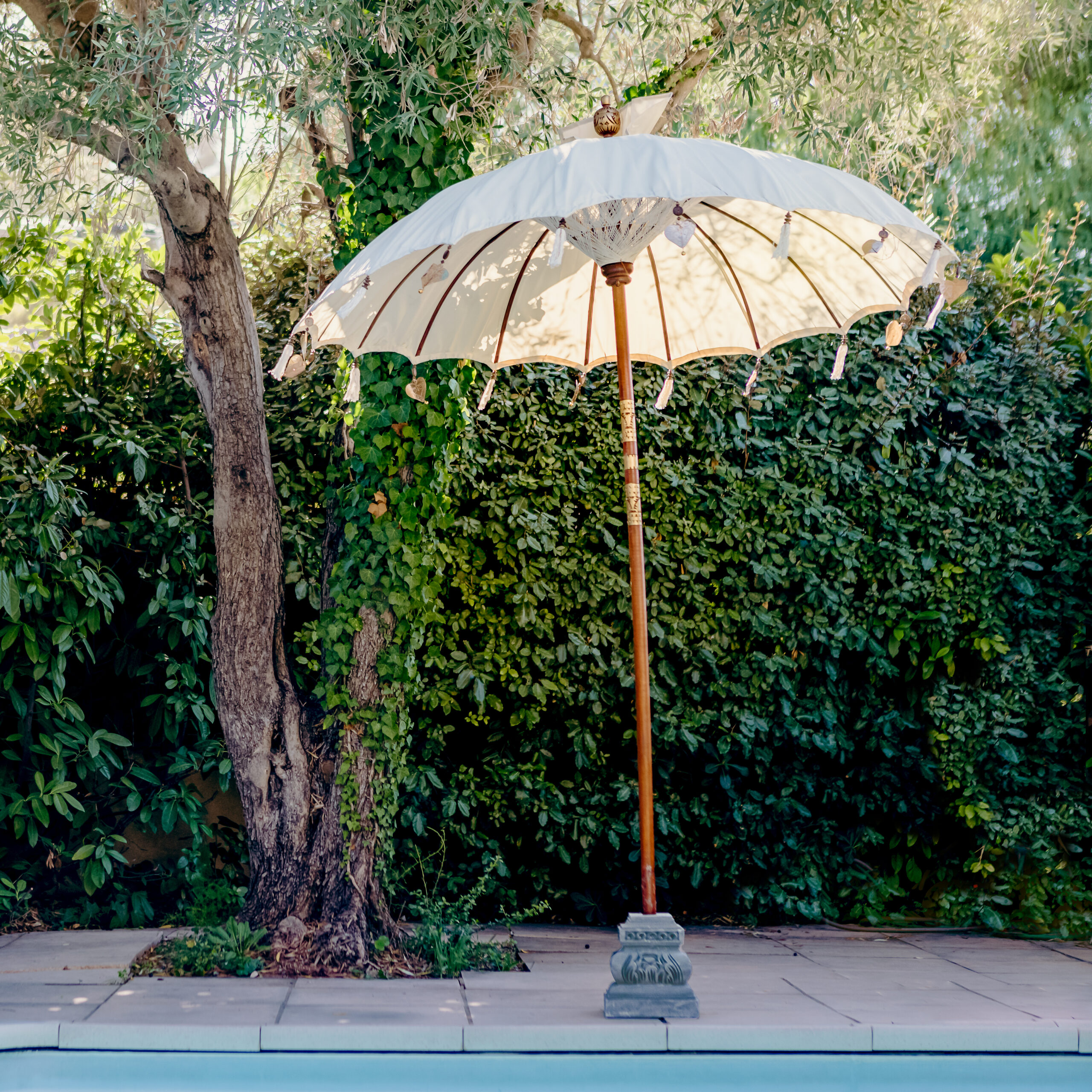 Amener la culture balinaise, empreinte de sérénité à votre jardin avec cette ombrelle en teck et coton écru. Craquez pour sa toile imperméable agrémentée de pampilles en métal et de pompons. Son manche en teck avec des parties sculptées dorées rajoutera une touche exotique chic à l’ensemble. Fournis avec un pied original sculpter au motif d’UBUD en ciment naturel. Existe en 2 tailles et différents coloris.